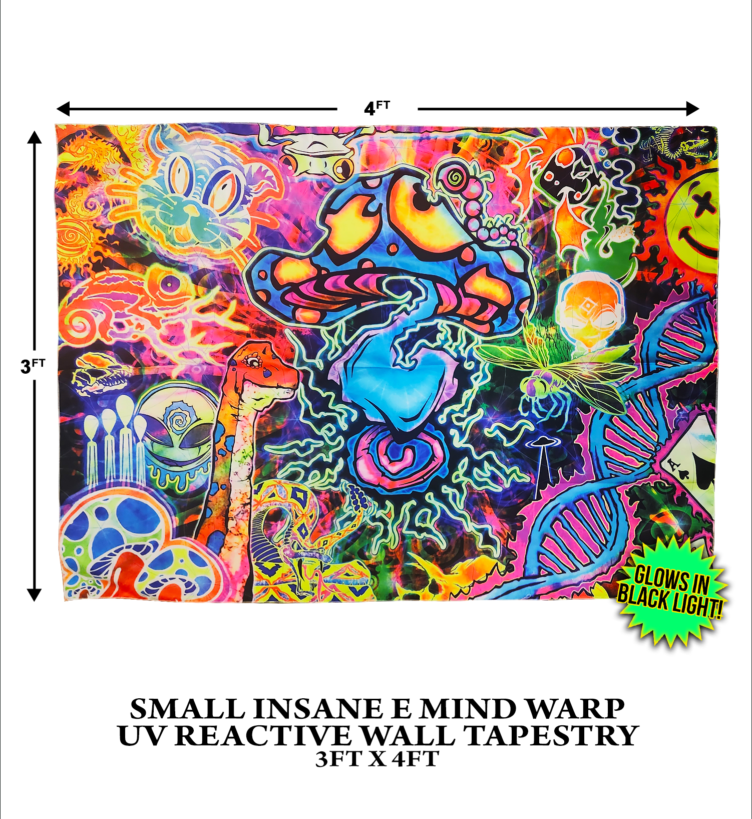 These BLACK LIGHT REACTIVE tapestries make for the perfect conversation starter or attention grabber in any room, any time, anywhere! Featuring 100% ORIGINAL ARTWORK from Insane E and printed with EXTREMELY BOLD UV INKS! Light weight and highly detailed!